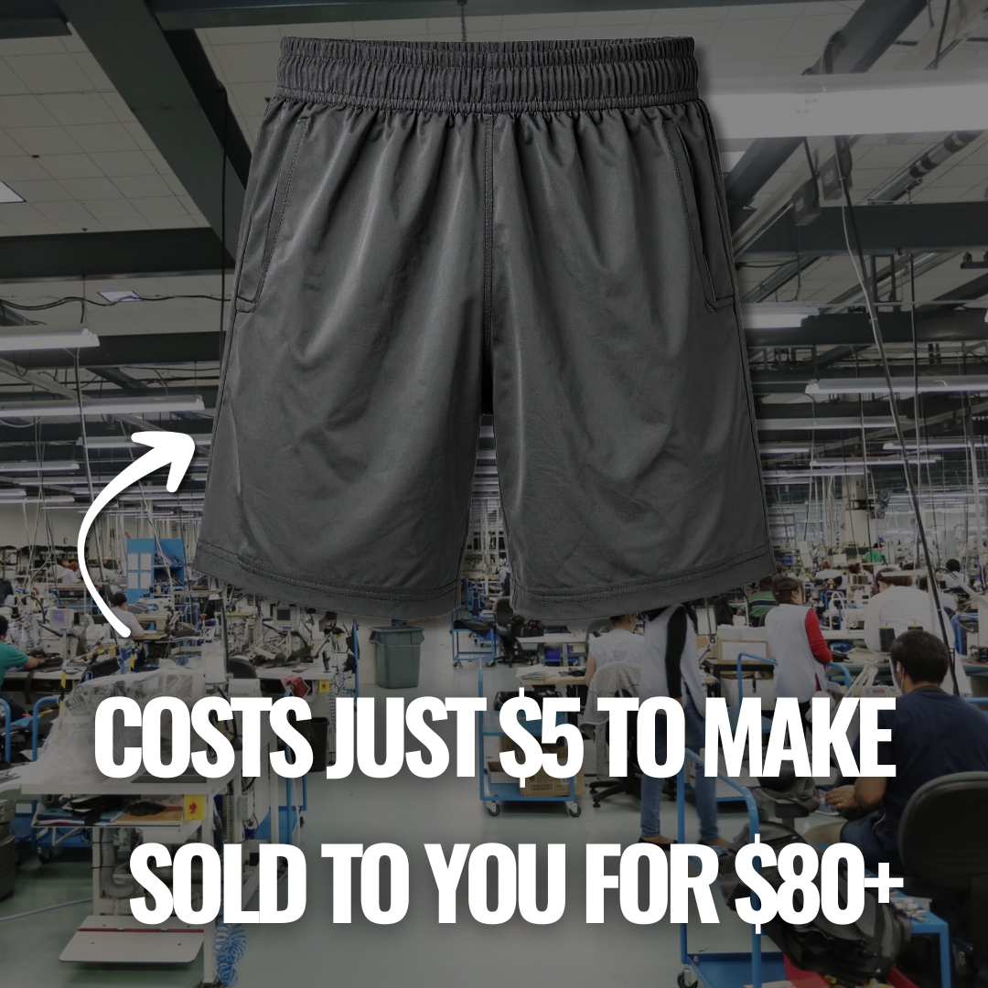 Polyester shorts are incredibly cheap to make (ask us how we know 😂)