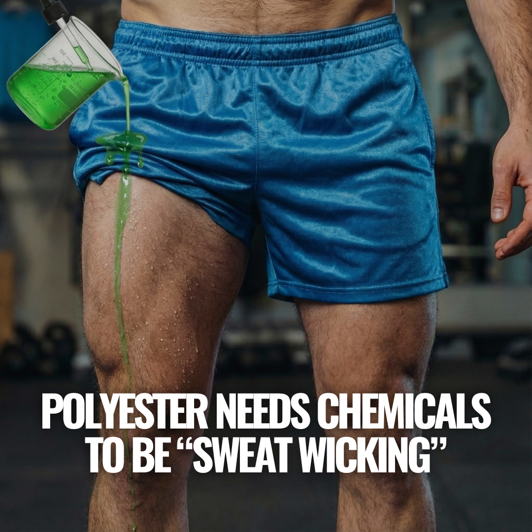Every time you wear polyester shorts, tiny microplastics shed from the fabric onto your skin. And when you sweat - your pores open up - making you even more susceptible to these microplastics & toxic chemicals!